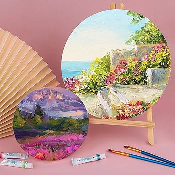 Size: 8 inches in diameter. Material: Typically made from 100% cotton canvas stretched over a rigid surface. Usage: Suitable for various media, including oil, acrylic, and tempera paints.