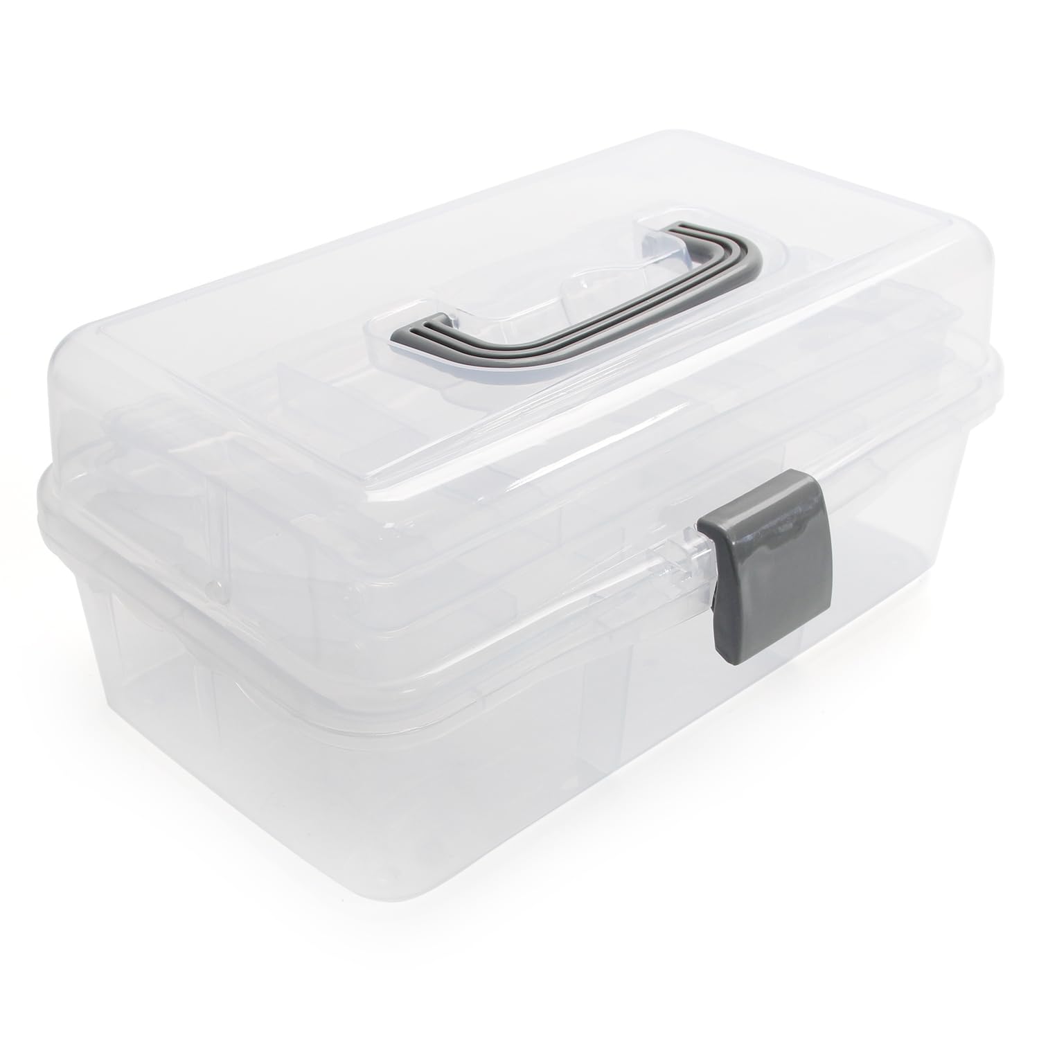 Keep your paint, craft supplies, fishing tackle, sewing notions and more organized portable and easy to access. wide storage box features 2 cantilever trays inside plus a bulk bottom bin Clear plastic design with carrying handle on lid and a snap tight clasp