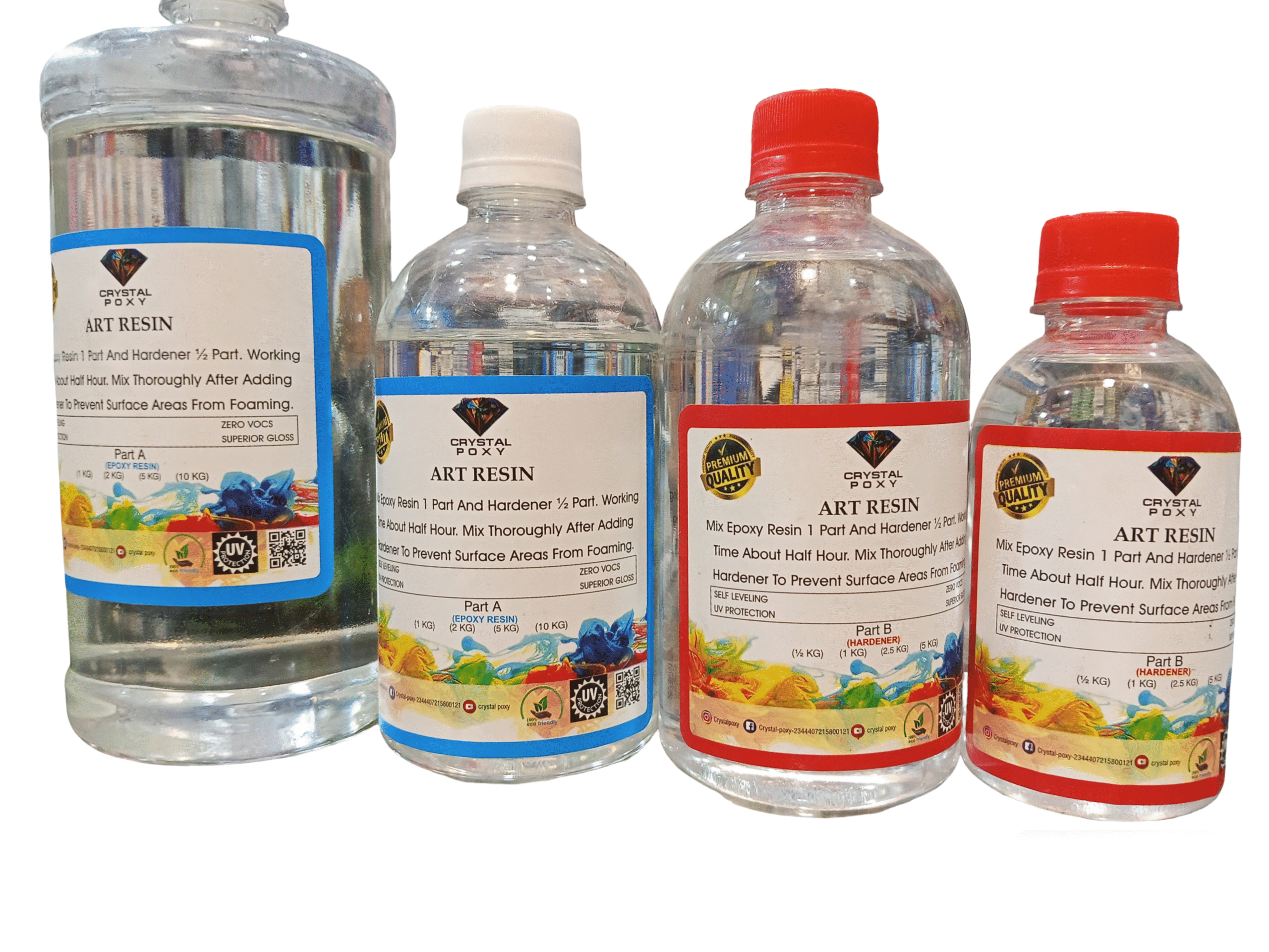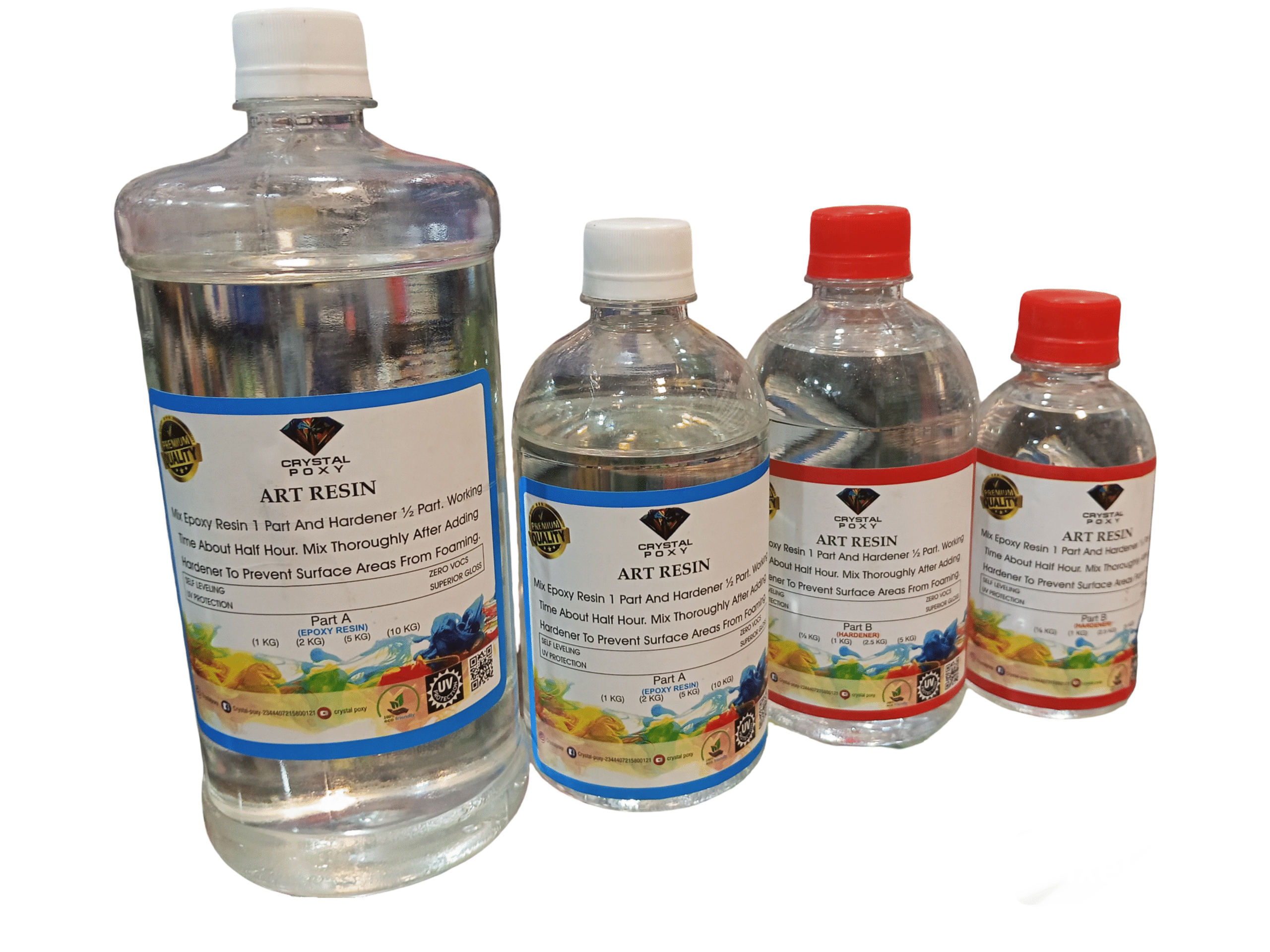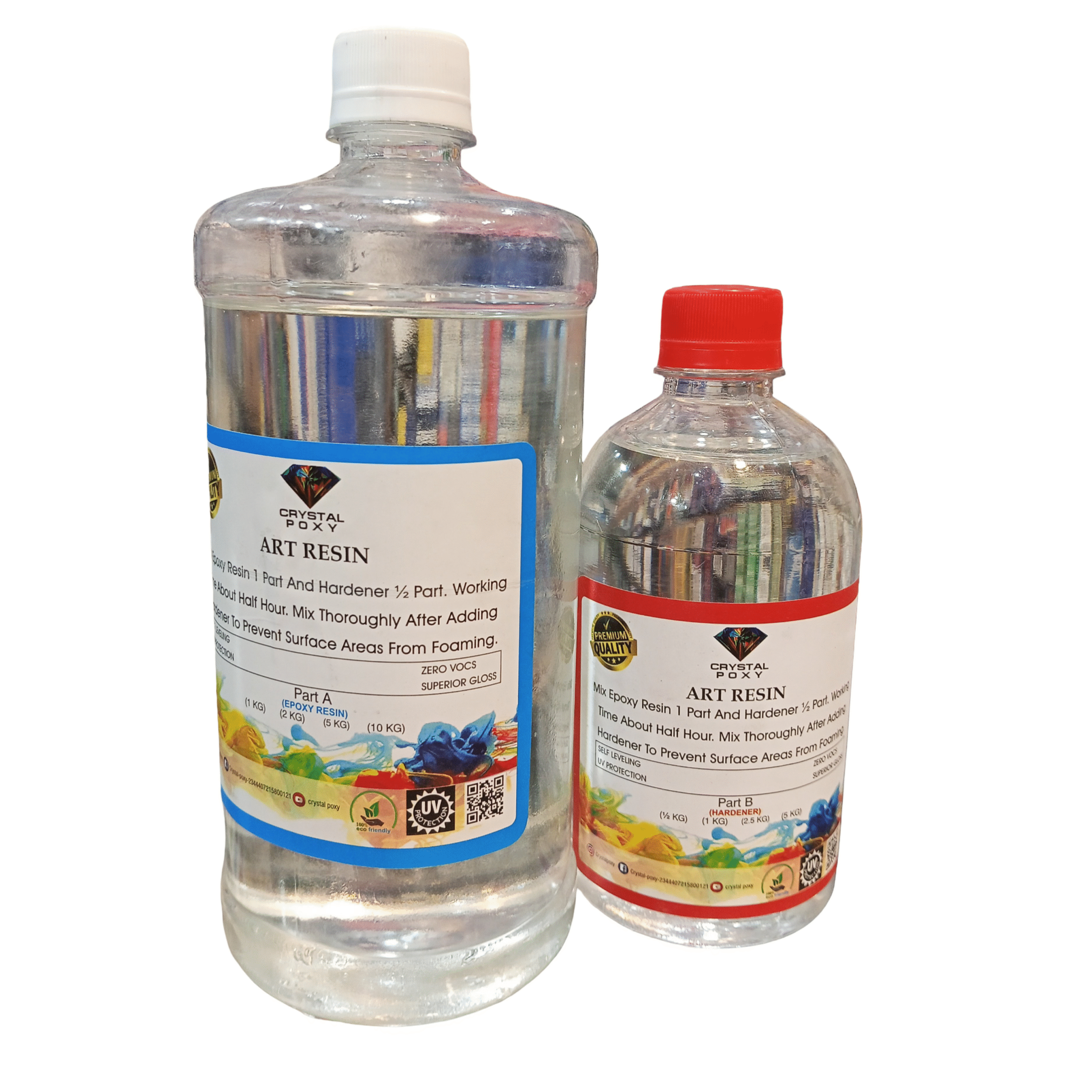 Composition: It’s a two-part epoxy resin system consisting of Part A (Epoxy Resin) and Part B (Hardener). The specific bottles in the image suggest a mixing ratio where Part A (Epoxy Resin) is combined with a smaller proportion of Part B (Hardener), indicated by “1 Part And Hardener ½ Part” on one label, and a “2:1 mixing ratio” mentioned in general descriptions for Crystal Poxy Art Resin kits.