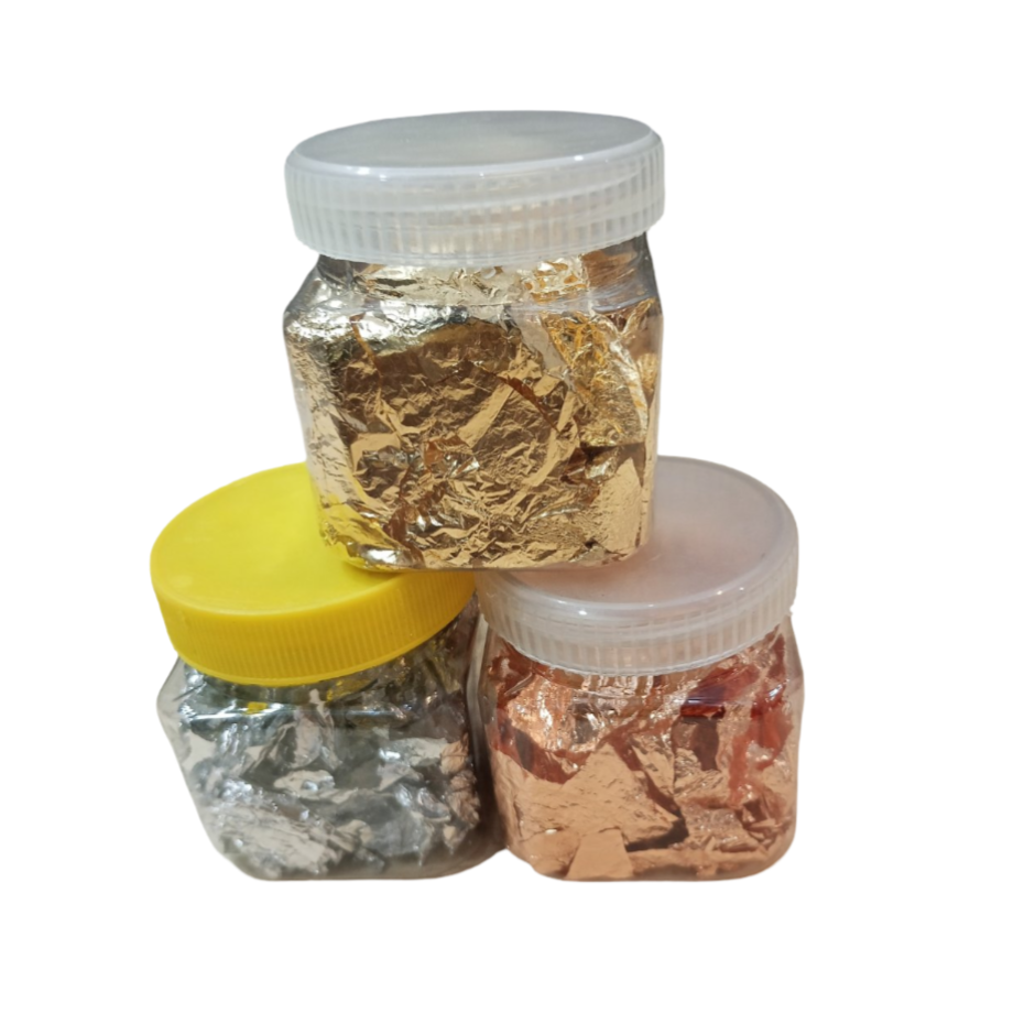 metallic leaf flakes, which are used for various crafts and artistic applications. The flakes are available in different colors, including gold, silver, and copper. These metallic flakes are often used for gilding, painting, and other arts and crafts. They are also popular for use in resin jewelry, nail art, and slime making. The flakes are…