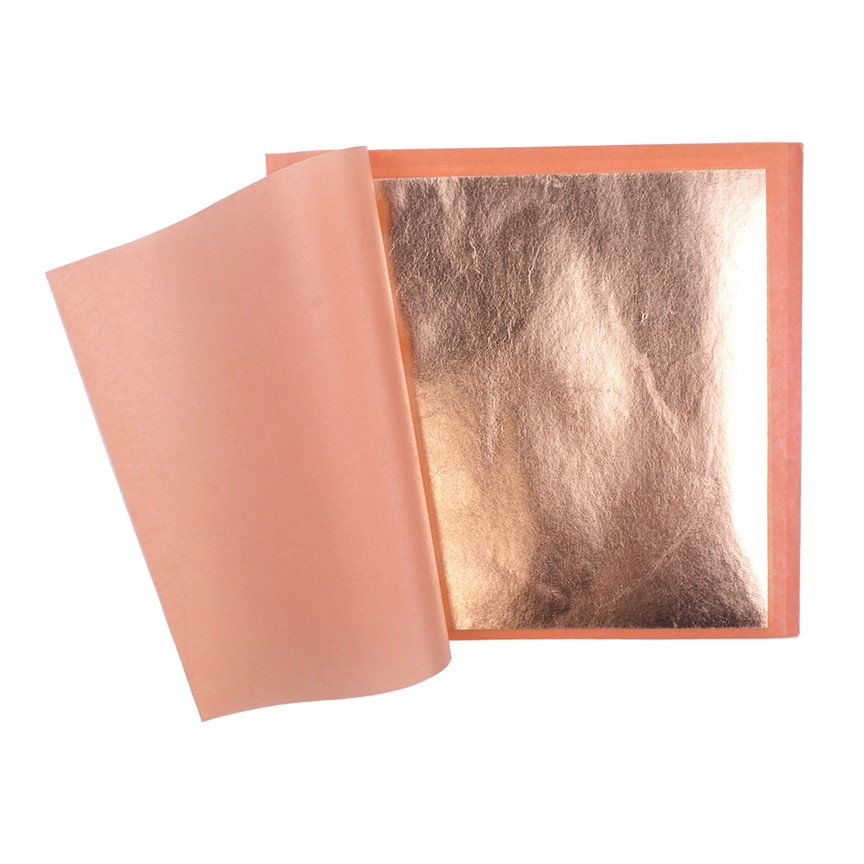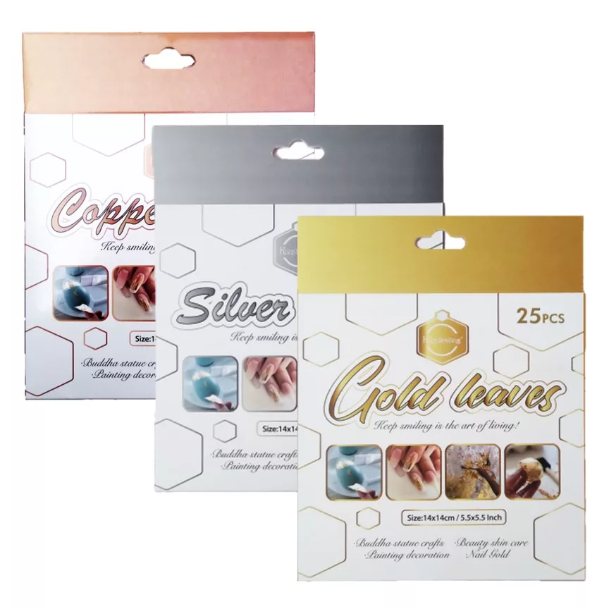 Product Name: Keep Smiling Metallic Foil Flakes (also referred to as Gold Leaves). Colors: Gold, Silver, and Copper. Quantity: 25 pieces. Dimensions: 14cm x 14cm (5.5 x 5.5 inches). Uses: The foil flakes can be used for handicrafts, painting, nail art, interior decoration, and with epoxy resin.