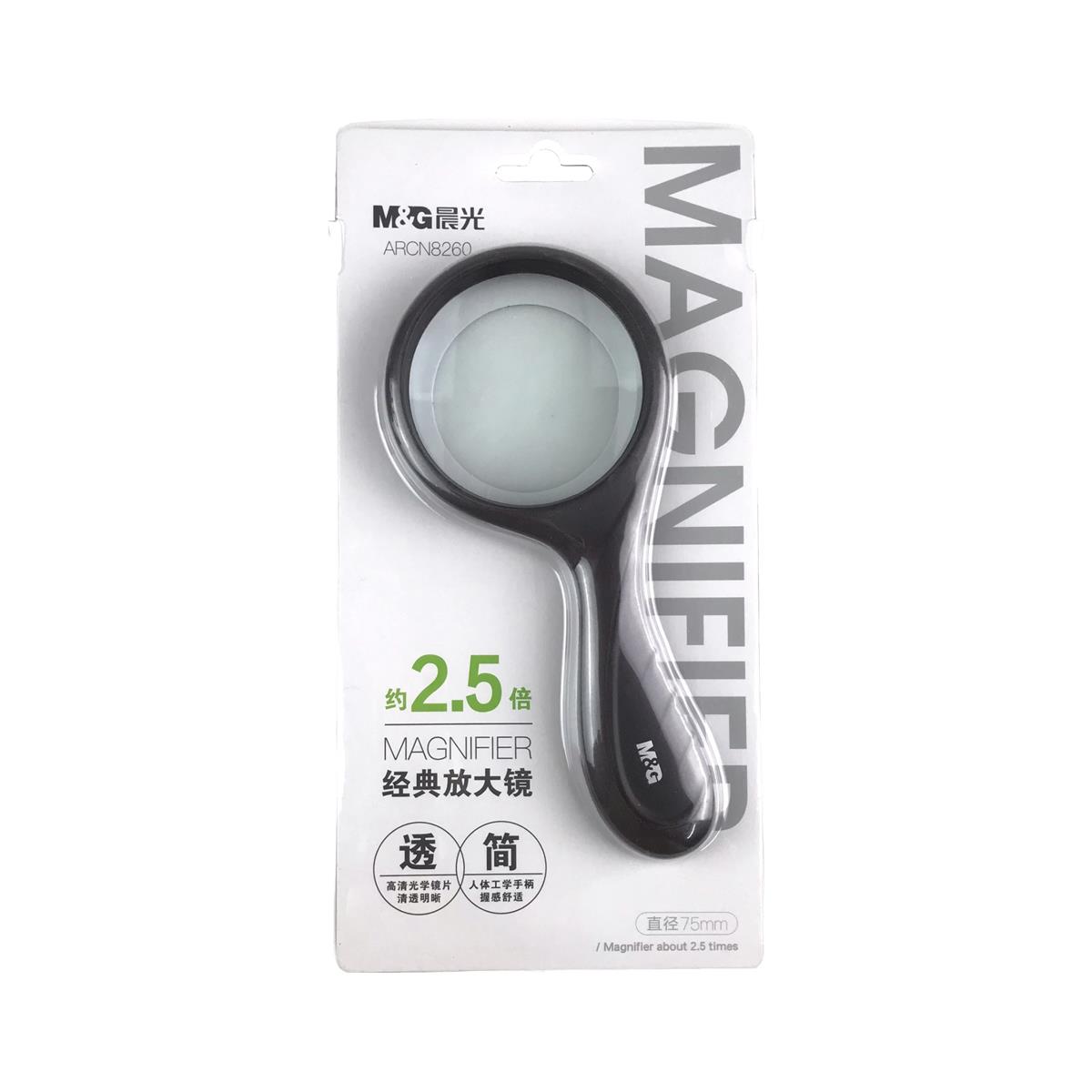 M&G ARCN8260 Magnifying Glass has : ฯ75 mm lens diameter Magnifying Glass. Clear convex lens for different use Magnification: 2.5X. Available in black colour Constructed of ABS frame + Glass main lens