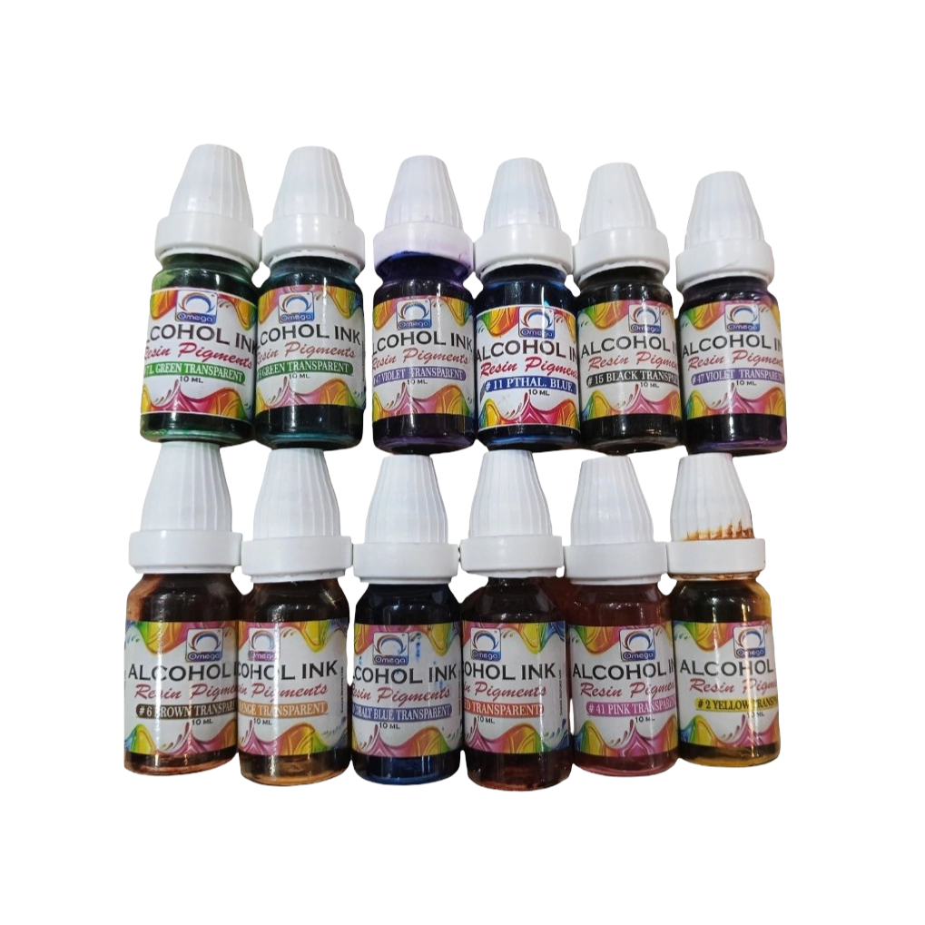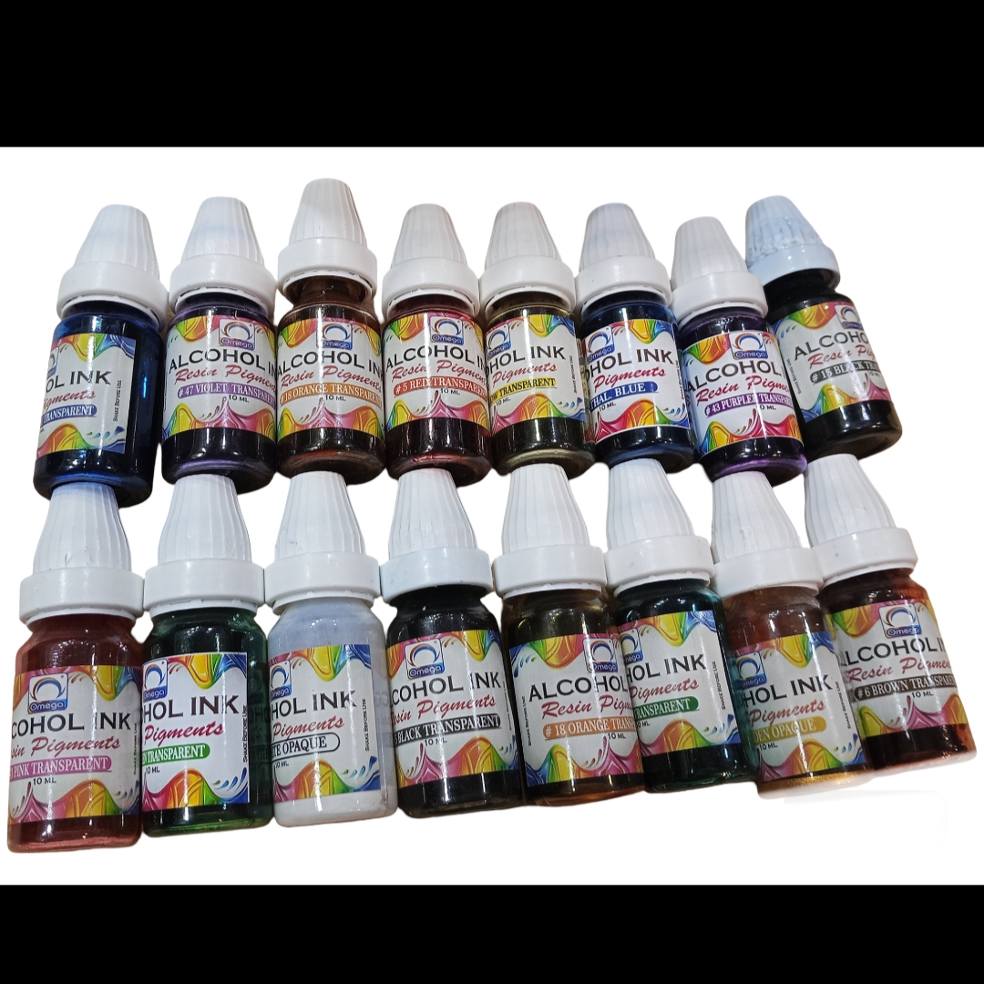 ‏12- and 16- color sets of Omega alcohol inks for resin art. These are liquid, dye-based pigments used for coloring epoxy resin and creating various artistic effects.