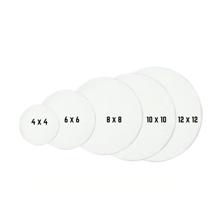 a set of five round canvases in various sizes, which are commonly used for painting with acrylics or oils. The canvases are made of cotton and are pre-primed, making them ready for use. The set includes canvases in the following sizes: 4×4, 6×6, 8×8, 10×10, and 12×12 inches. These types of canvases are suitable for…