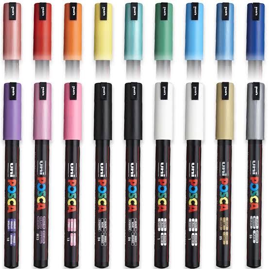 set of Uni Posca PC-3M water-based paint markers. These are paint markers suitable for use on over 50 surfaces including wood, glass, metal, plastic, ceramic, and leather. The markers have a fine 0.9-1.3 mm bullet tip that is reversible for extended use. The ink is opaque, vibrant, water-based, lightfast, waterproof, and non-toxic. The set includes…