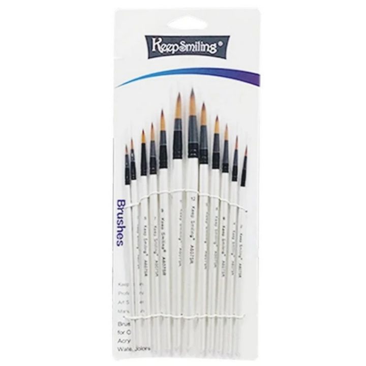 Keep Smiling A6075R Artist Brush Set, which is a 12-piece set of round, pointed-tip brushes designed for various painting mediums. Product: Keep Smiling A6075R Artist Brush Set (12 Pcs). Brush Type: Round, pointed-tip brushes. Material: Synthetic nylon hair with wooden handles. Usage: Suitable for oil, acrylic, watercolor, enamel, cel-vinyl, and gouache paints.